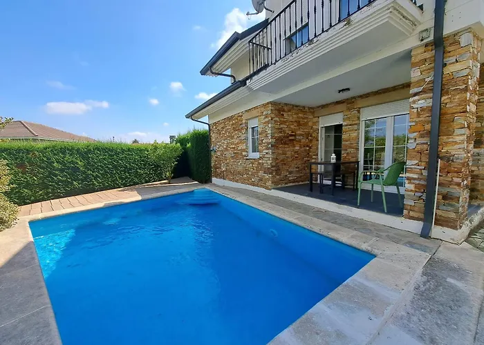 La Villa Suances 4 Dormitorios Hinojedo ofrece una terraza con vistas a la piscina y se encuentra a 22 minutos en coche del aeropuerto Santander.